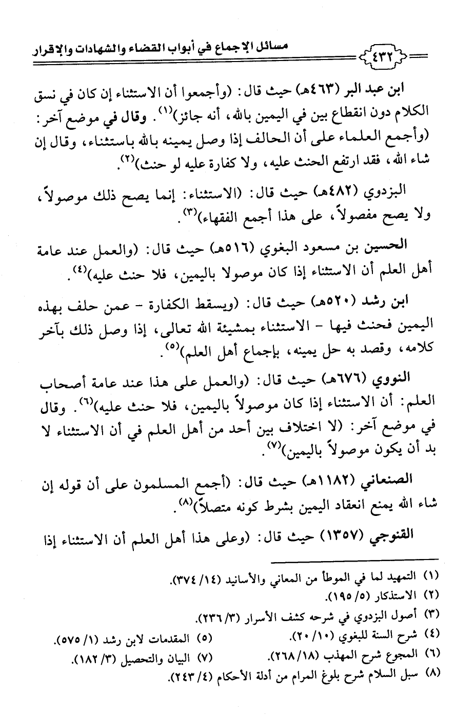 ابن عبد البر (463 هـ) حيث قال: (وأجمعوا أن الاستثناء إن كان في نسق الكلام دون انقطاع بين في اليمين باللَّه، أنه جائز) (¬1). وقال في موضع آخر: (وأجمع العلماء على أن الحالف إذا وصل يمينه باللَّه باستثناء، وقال إن شاء اللَّه، فقد ارتفع الحنث عليه، ولا كفارة عليه لو حنث) (¬2).