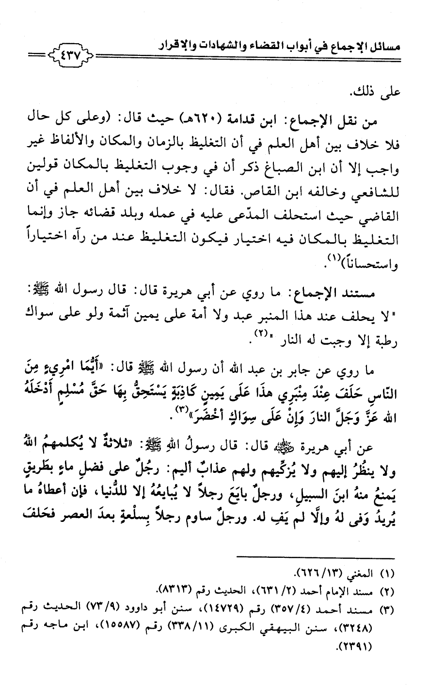 • من نقل الإجماع: ابن قدامة (620 هـ) حيث قال: (وعلى كل حال فلا خلاف بين أهل العلم في أن التغليظ بالزمان والمكان والألفاظ غير واجب إلا أن ابن الصباغ ذكر أن في وجوب التغليظ بالمكان قولين للشافعي وخالفه ابن القاص. فقال: لا خلاف بين أهل العلم في أن القاضي حيث استحلف المدّعى عليه في عمله وبلد قضائه جاز وإنما التغليظ بالمكان فيه اختيار فيكون التغليظ عند من رآه اختيارًا واستحسانًا) (¬1).
