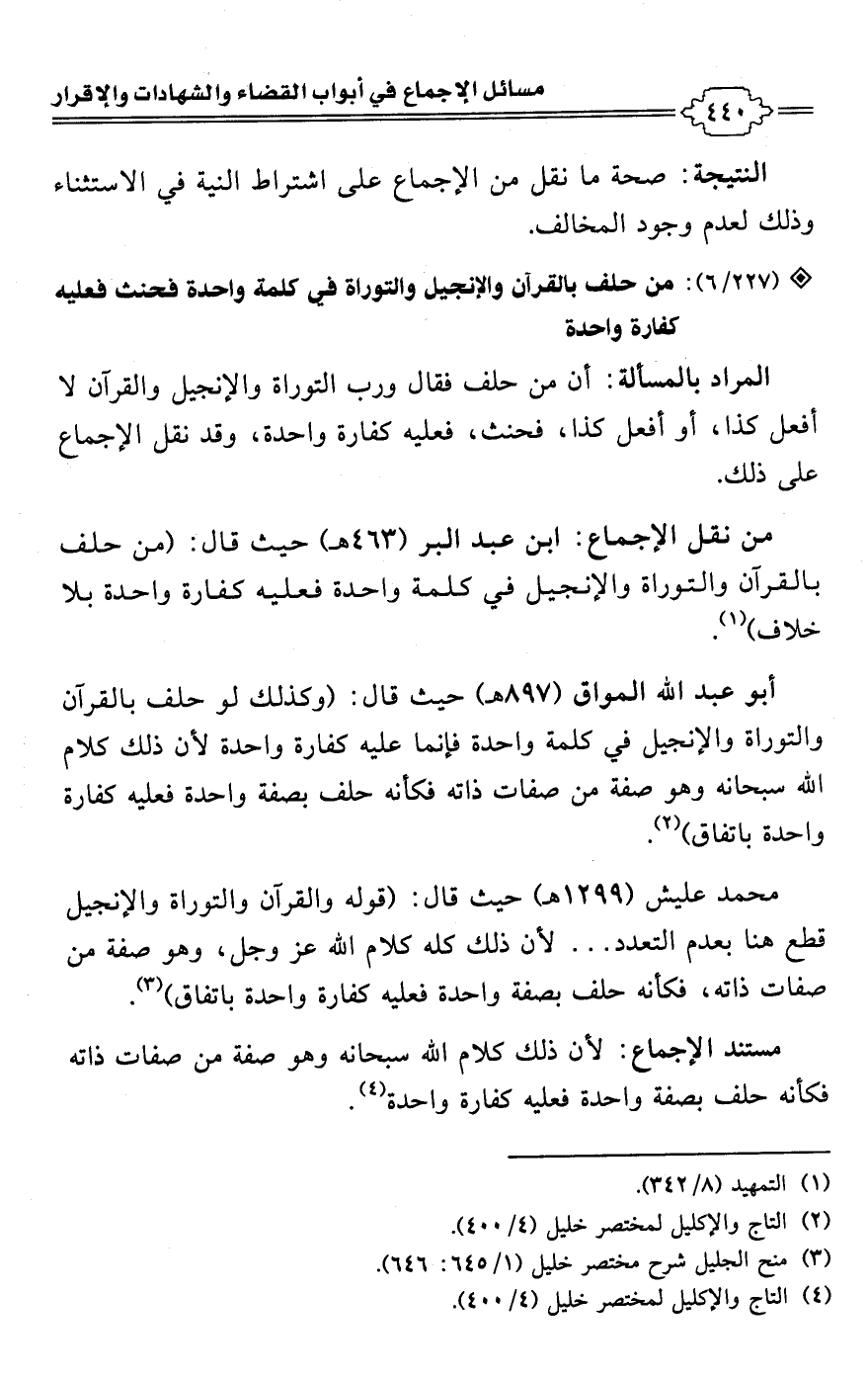 • من نقل الإجماع: ابن عبد البر (463 هـ) حيث قال: (من حلف بالقرآن والتوراة والإنجيل في كلمة واحدة فعليه كفارة واحدة بلا خلاف (¬1).