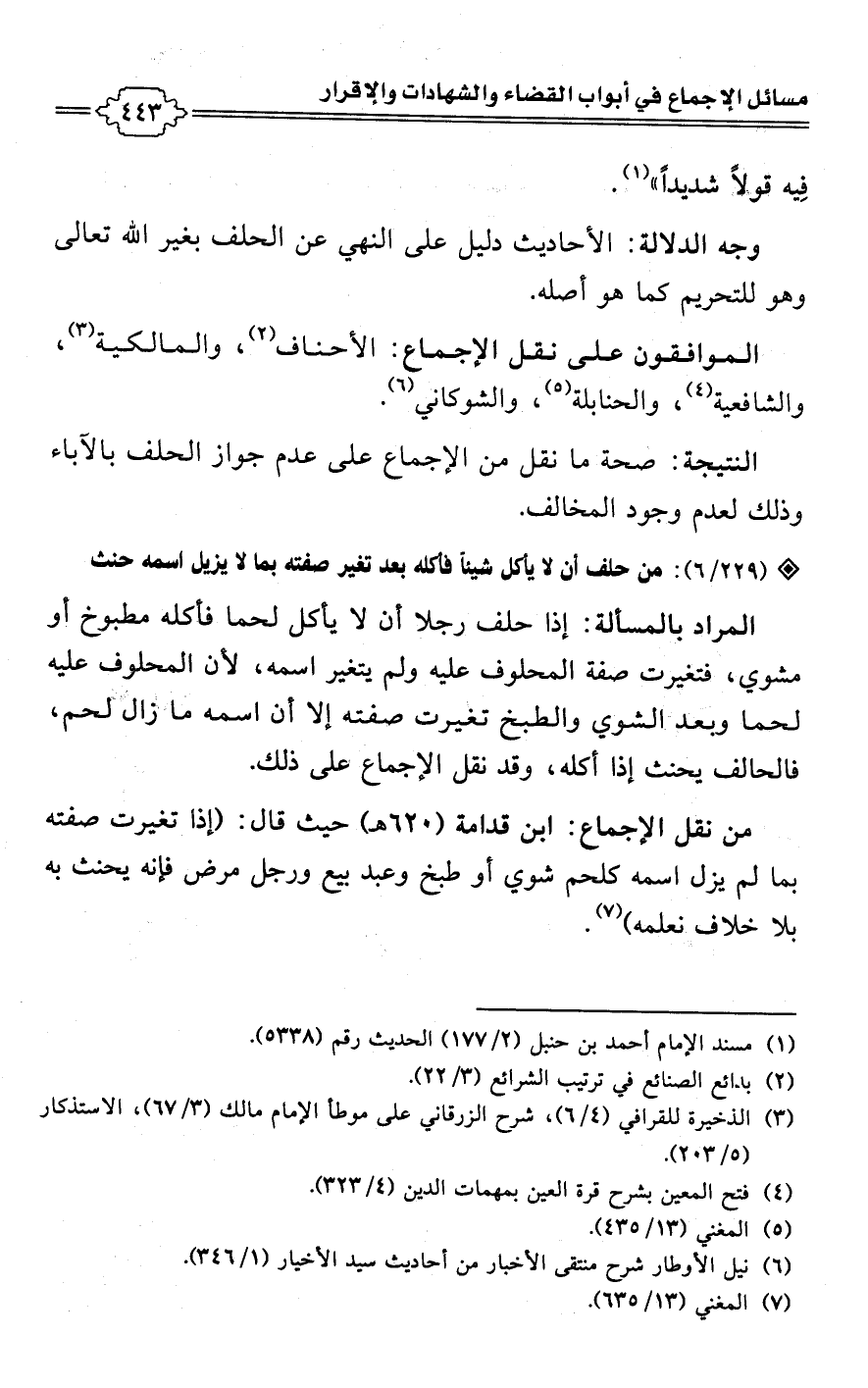 • من نقل الإجماع: ابن قدامة (620 هـ) حيث قال: (إذا تغيرت صفته بما لم يزل اسمه كلحم شوي أو طبخ وعبد بيع ورجل مرض فإنه يحنث به بلا خلاف نعلمه) (¬7).