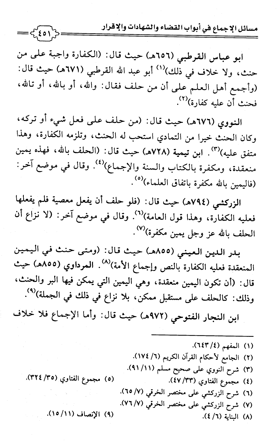 النووي (676 هـ) حيث قال: (من حلف على فعل شيء أو تركه، وكان الحنث خيرا من التمادي استحب له الحنث، وتلزمه الكفارة، وهذا متفق عليه) (¬3). ابن تيمية (728 هـ) حيث قال: (الحلف باللَّه، فهذه يمين منعقدة، ومكفرة بالكتاب والسنة والإجماع) (¬4). وقال في موضع آخر: (فاليمين باللَّه مكفرة باتفاق العلماء) (¬5).