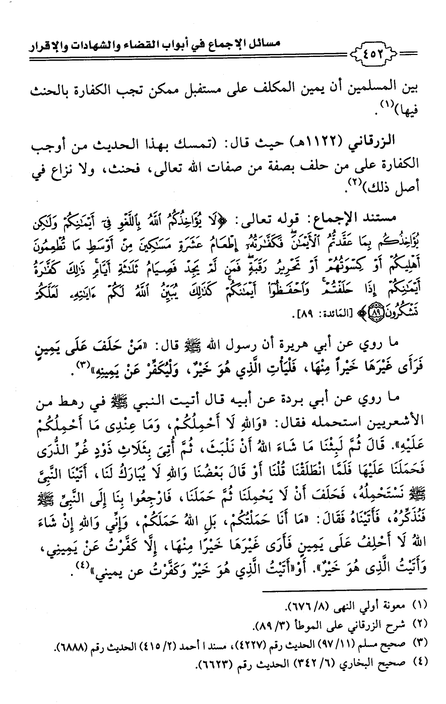 الزرقاني (1122 هـ) حيث قال: (تمسك بهذا الحديث من أوجب الكفارة على من حلف بصفة من صفات اللَّه تعالى، فحنث، ولا نزاع في أصل ذلك) (¬2).