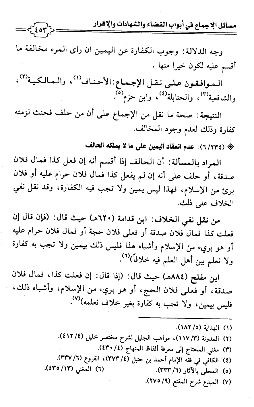 ابن مفلح (884 هـ) حيث قال: (إذا قال: إن فعلت كذا، فمال فلان صدقة، أو فعلى فلان الحج، أو هو بريء من الإسلام، وأشباه ذلك، فليس بيمين، ولا تجب به كفارة بغير خلاف نعلمه) (¬7).