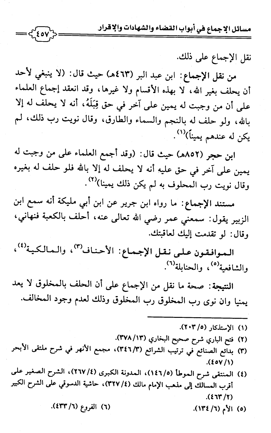 • من نقل الإجماع: ابن عبد البر (463 هـ) حيث قال: (لا ينبغي لأحد أن يحلف بغير اللَّه، لا بهذه الأقسام ولا غيرها، وقد انعقد إجماع العلماء على أن من وجبت له يمين على آخر في حق قِبَلَهُ، أنه لا يحلف له إلا باللَّه، ولو حلف له بالنجم والسماء والطارق، وقال نويت رب ذلك، لم يكن له عندهم يمينًا) (¬1).