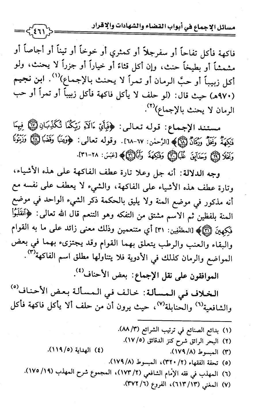 • مستند الإجماع: قوله تعالى: {فَبِأَيِّ آلَاءِ رَبِّكُمَا تُكَذِّبَانِ (67) فِيهِمَا فَاكِهَةٌ وَنَخْلٌ وَرُمَّانٌ (68)} [الرحمن: 67 - 68]. وقوله تعالى: {وَعِنَبًا وَقَضْبًا (28) وَزَيْتُونًا وَنَخْلًا (29) وَحَدَائِقَ غُلْبًا (30) وَفَاكِهَةً وَأَبًّا (31)} [عبس: 28 - 31].