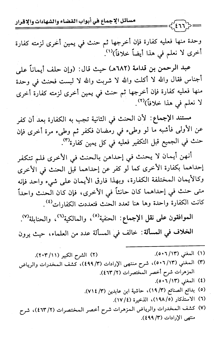 • مستند الإجماع: لأن الحنث في الثانية تجب به الكفارة بعد أن كفر عن الأولى فأشبه ما لو وطئ في رمضان فكفر ثم وطئ مرة أخرى فإن حنث في الجميع قبل التكفير فعليه في كل يمين كفارة (¬3).