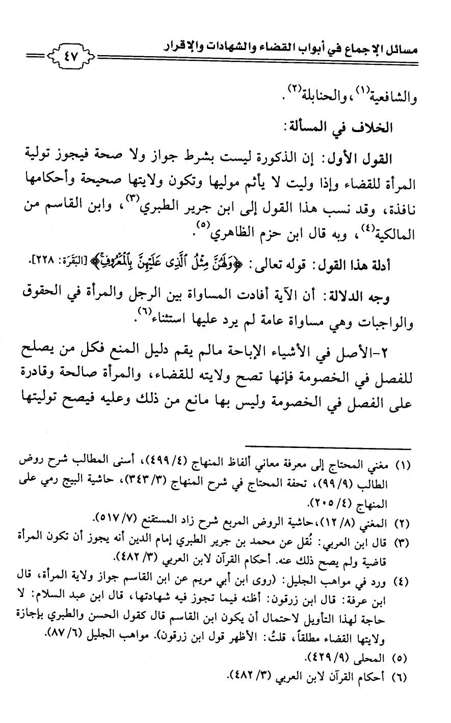 (¬3) قال ابن العربي: نُقل عن محمد بن جرير الطبري إمام الدين أنه يجوز أن تكون المرأة قاضية ولم يصح ذلك عنه. أحكام القرآن لابن العربي (3/ 482).
