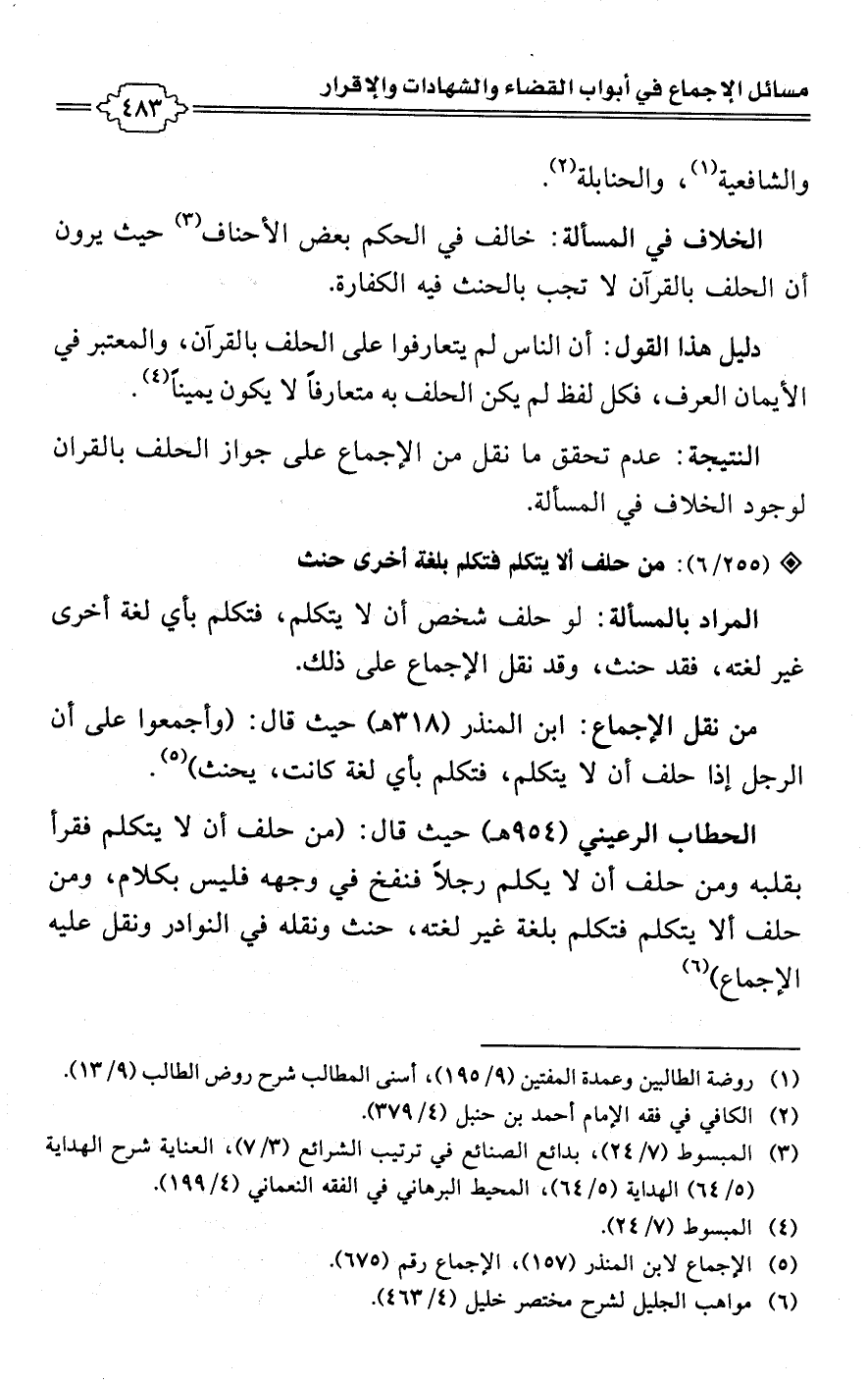الحطاب الرعيني (954 هـ) حيث قال: (من حلف أن لا يتكلم فقرأ بقلبه ومن حلف أن لا يكلم رجلًا فنفخ في وجهه فليس بكلام، ومن حلف ألا يتكلم فتكلم بلغة غير لغته، حنث ونقله في النوادر ونقل عليه الإجماع) (¬6)
