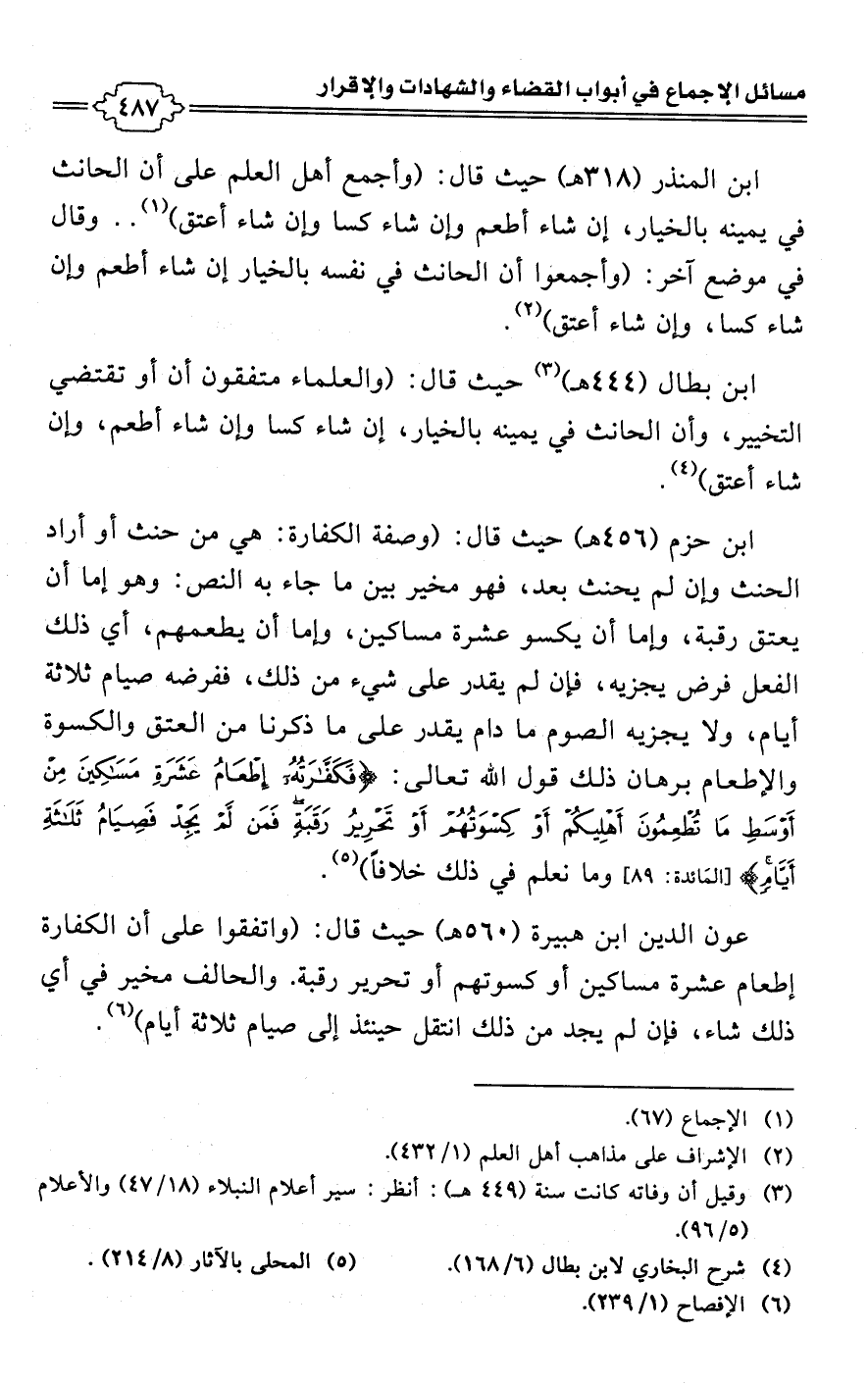 عون الدين ابن هبيرة (560 هـ) حيث قال: (واتفقوا على أن الكفارة إطعام عشرة مساكين أو كسوتهم أو تحرير رقبة. والحالف مخير في أي ذلك شاء، فإن لم يجد من ذلك انتقل حينئذ إلى صيام ثلاثة أيام) (¬6).