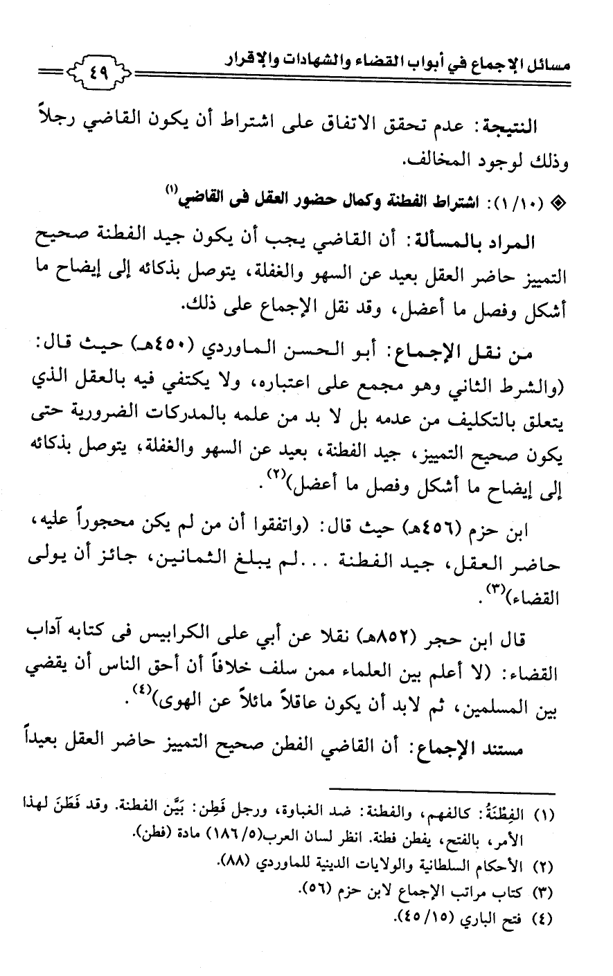 • من نقل الإجماع: أبو الحسن الماوردي (450 هـ) حيث قال: (والشرط الثاني وهو مجمع على اعتباره، ولا يكتفي فيه بالعقل الذي يتعلق بالتكليف من عدمه بل لا بد من علمه بالمدركات الضرورية حتى يكون صحيح التمييز، جيد الفطنة، بعيد عن السهو والغفلة؛ يتوصل بذكائه إلى إيضاح ما أشكل وفصل ما أعضل) (¬2).