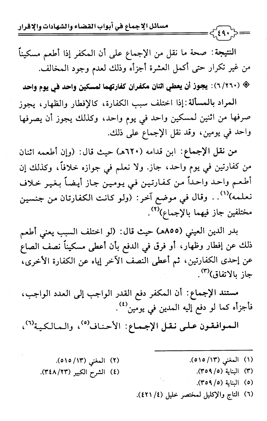 • من نقل الإجماع: ابن قدامة (620 هـ) حيث قال: (وإن أطعمه اثنان من كفارتين في يوم واحد، جاز. ولا نعلم في جوازه خلافًا، وكذلك إن أطعم واحد واحدًا من كفارتين في يومين جاز أيضًا بغير خلاف نعلمه) (¬1). . وقال في موضع آخر: (ولو كانت الكفارتان من جنسين مختلفين جاز فيهما بالإجماع) (¬2).