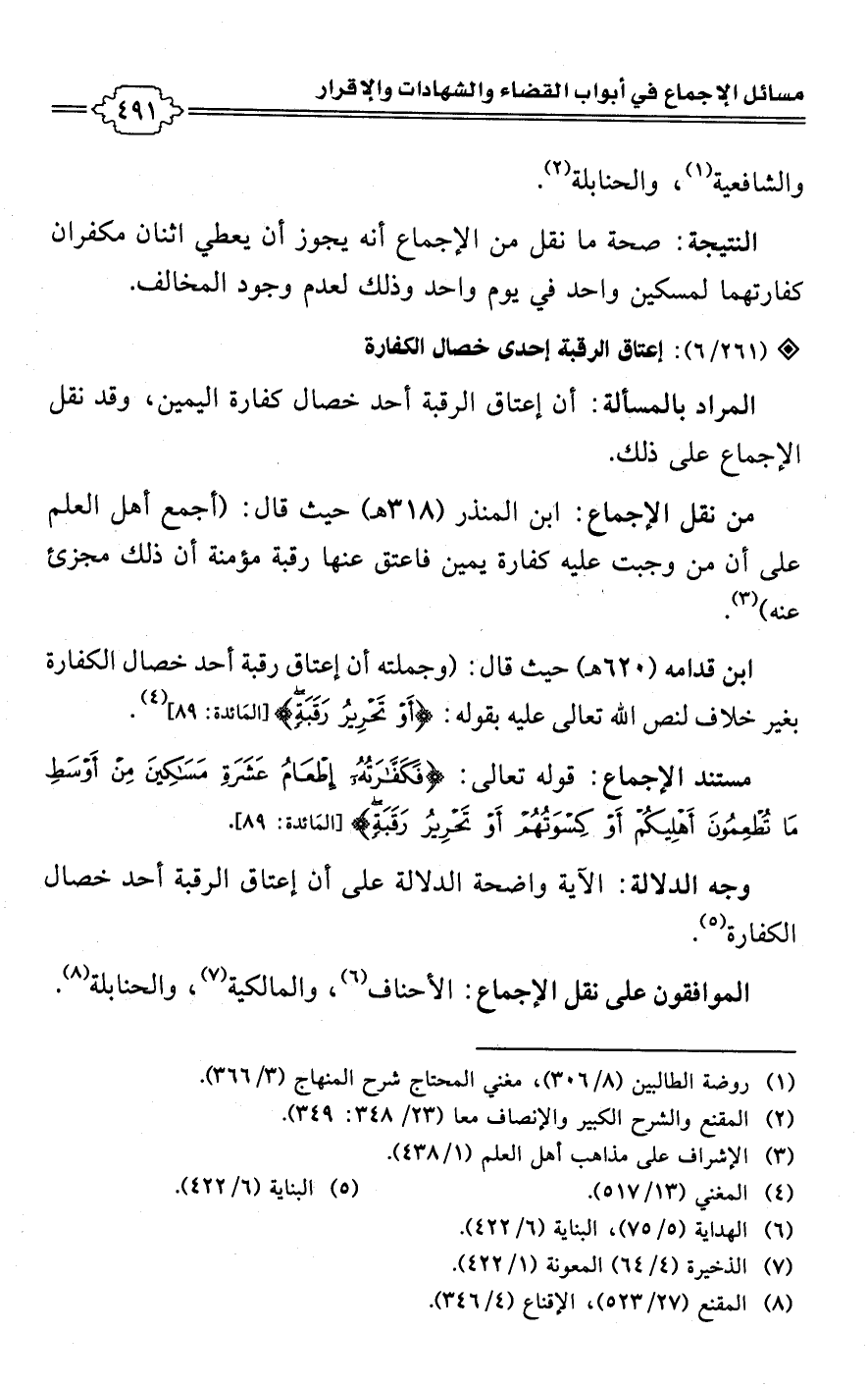 ابن قدامة (620 هـ) حيث قال: (وجملته أن إعتاق رقبة أحد خصال الكفارة بغير خلاف لنص اللَّه تعالى عليه بقوله: {أَوْ تَحْرِيرُ رَقَبَةٍ} [المائدة: 89] (¬4).