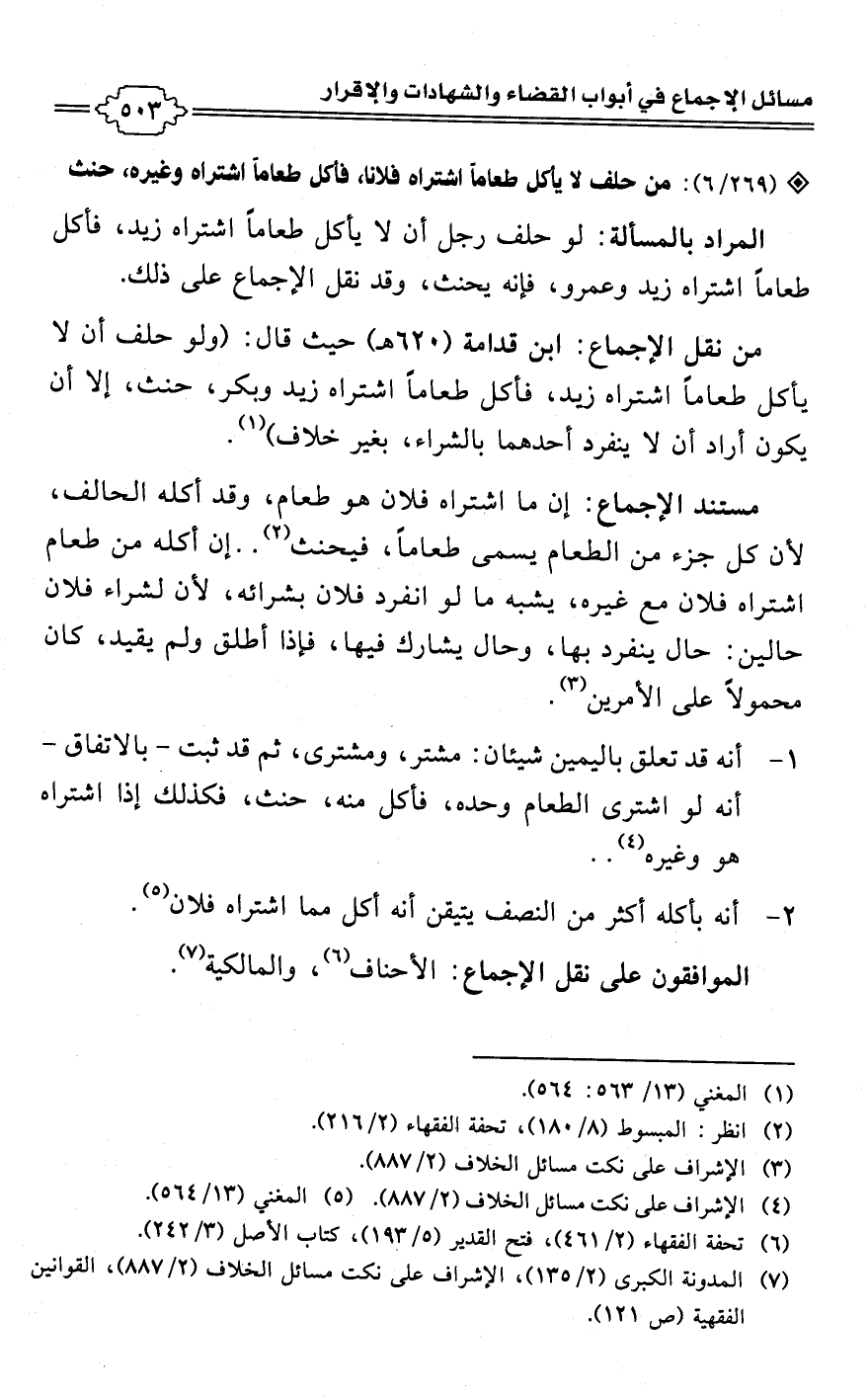 • من نقل الإجماع: ابن قدامة (620 هـ) حيث قال: (ولو حلف أن لا يأكل طعامًا اشتراه زيد، فأكل طعامًا اشتراه زيد وبكر، حنث، إلا أن يكون أراد أن لا ينفرد أحدهما بالشراء، بغير خلاف) (¬1).
