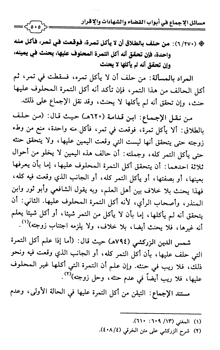 • من نقل الإجماع: ابن قدامة (620 هـ) حيث قال: (من حلف بالطلاق: ألا يأكل تمرة، فوقعت في تمر، فأكل منه واحدة، منع من وطء زوجته حتى يتحقق أنها ليست التي وقعت اليمين عليها، ولا يتحقق حنثه حتى يأكل التمر كله، وجملته: أن حالف هذه اليمين لا يخلو من أحوال ثلاثة أحدهما: أن يتحقق أكل التمرة المحلوف عليها، إما بأن يعرفها بعينها، أو بصفتها، أو يأكل التمر كله، أو الجانب الذي وقعت فيه كله، فهذا يحنث بلا خلاف بين أهل العلم، وبه يقول الشافعي وأبو ثور وابن المنذر، وأصحاب الرأي، لأنه أكل التمرة المحلوف عليها. الثاني: أن يتحقق أنه لم يأكلها، إما بأن لا يأكل من التمر شيئا، أو أكل شيئا يعلم أنه غيرها، فلا يحنث أيضا، بلا خلاف، ولا يلزمه اجتناب زوجته) (¬1).
