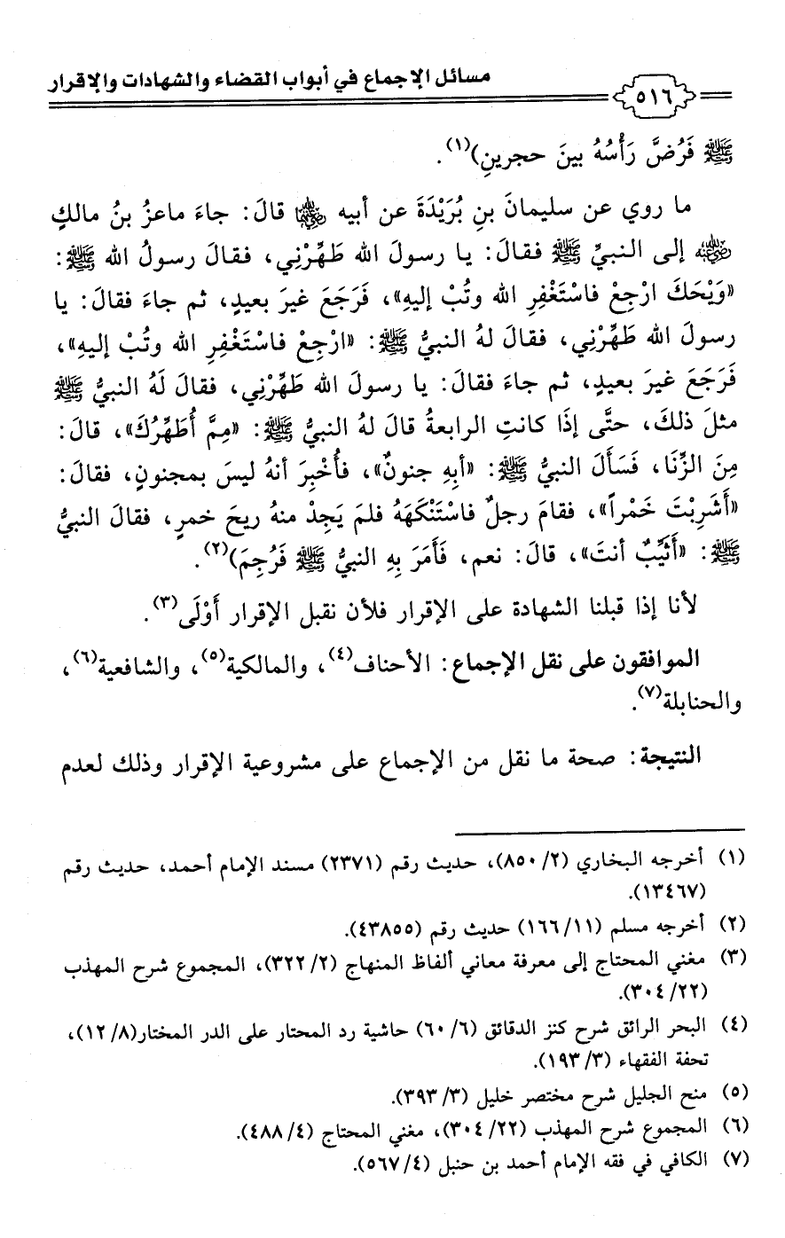 ما روي عن سليمانَ بنِ بُرَيْدَةَ عن أبيه -رضي اللَّه عنهما- قالَ: جاءَ ماعزُ بنُ مالكٍ -رضي اللَّه عنه- إلى النبيِّ -صلى اللَّه عليه وسلم- فقالَ: يا رسولَ اللَّه طَهِّرْنِي، فقالَ رسولُ اللَّه -صلى اللَّه عليه وسلم-: "وَيْحَكَ ارْجِعْ فاسْتَغْفِرِ اللَّه وتُبْ إليهِ"، فَرَجَعَ غيرَ بعيدٍ، ثم جاءَ فقالَ: يا رسولَ اللَّه طَهِّرْنِي، فقالَ لهُ النبيُّ -صلى اللَّه عليه وسلم-: "ارْجِعْ فاسْتَغْفِرِ اللَّه وتُبْ إليهِ"، فَرَجَعَ غيرَ بعيدٍ، ثم جاءَ فقالَ: يا رسولَ اللَّه طَهِّرْنِي، فقالَ لَهُ النبيُّ -صلى اللَّه عليه وسلم- مثلَ ذلكَ، حتَّى إذَا كانتِ الرابعةُ قالَ لهُ النبيُّ -صلى اللَّه عليه وسلم-: "مِمَّ أُطَهِّرُكَ"، قالَ: مِنَ الزِّنَا، فَسَأَلَ النبيُّ -صلى اللَّه عليه وسلم-: "أبِهِ جنونٌ"، فأُخْبِرَ أنهُ ليسَ بمجنونٍ، فقالَ: "أَشَرِبْتَ خَمْرًا"، فقامَ رجلٌ فاسْتَنْكَهَهُ فلمَ يَجِدْ منهُ ريحَ خمرٍ، فقالَ النبيُّ -صلى اللَّه عليه وسلم-: "أَثَيِّبٌ أنتَ"، قالَ: نعم، فَأَمَرَ بِهِ النبيُّ -صلى اللَّه عليه وسلم- فَرُجِمَ) (¬2).
