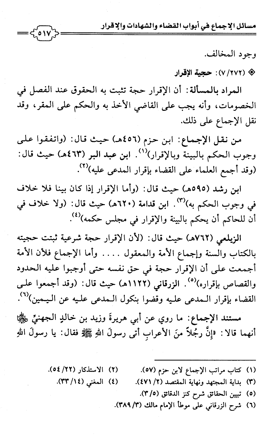 الزيلعي (762 هـ) حيث قال: (لأن الإقرار حجة شرعية ثبتت حجيته بالكتاب والسنة وإجماع الأمة والمعقول. . . وأما الإجماع فلأن الأمة أجمعت على أن الإقرار حجة في حق نفسه حتى أوجبوا عليه الحدود والقصاص بإقراره) (¬5). الزرقاني (1122 هـ) حيث قال: (وقد أجمعوا على القضاء بإقرار المدعى عليه وقضوا بنكول المدعى عليه عن اليمين) (¬6).