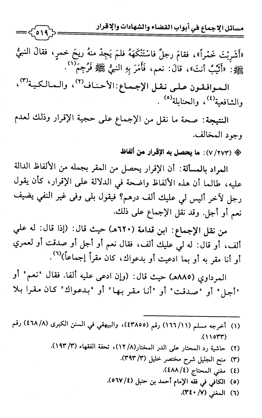 • من نقل الإجماع: ابن قدامة (620 هـ) حيث قال: (إذا قال: له علي ألف، أو قال: له لي عليك ألف، فقال نعم أو أجل أو صدقت أو لعمري أو أنا مقر به أو بما ادعيت أو بدعواك، كان مقرًا إجماعًا) (¬6).