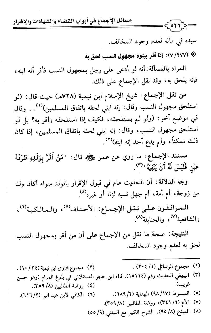 • من نقل الإجماع: شيخ الإسلام ابن تيمية (728 هـ) حيث قال: (لو استلحق مجهول النسب وقال: إنه ابني لحقه باتفاق المسلمين) (¬1). . وقال في موضع آخر: (ولو لم يستلحقه، فكيف إذا استلحقه وأقر به؟ بل لو استلحق مجهول النسب، وقال: إنه ابني لحقه باتفاق المسلمين، إذا كان ذلك ممكنًا، ولم ياع أحد إنه ابنه) (¬2).