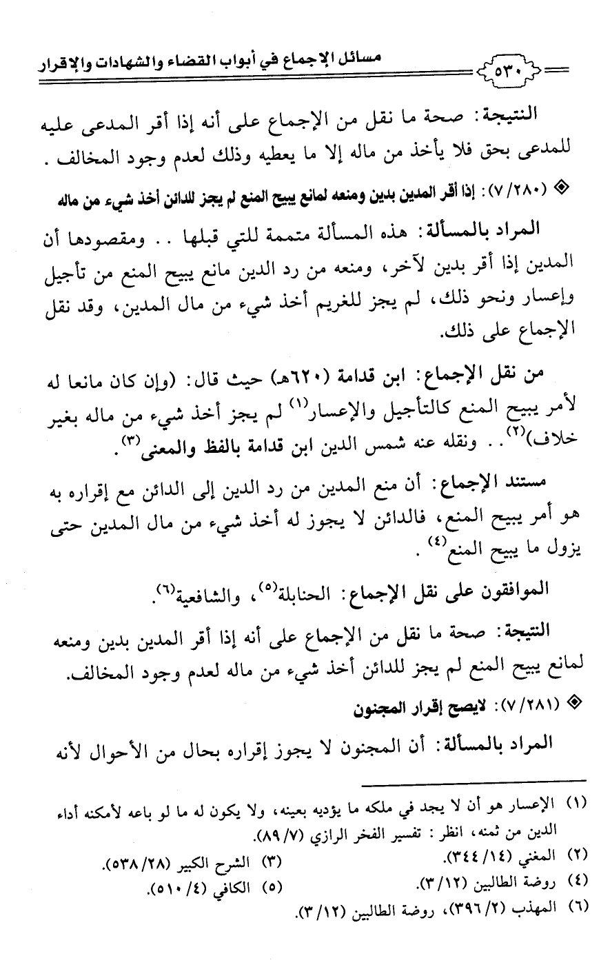 • من نقل الإجماع: ابن قدامة (620 هـ) حيث قال: (وإن كان مانعا له لأمر يبيح المنع كالتأجيل والإعسار (¬1) لم يجز أخذ شيء من ماله بغير خلاف) (¬2). . ونقله عنه شمس الدين ابن قدامة بالفظ والمعنى (¬3).