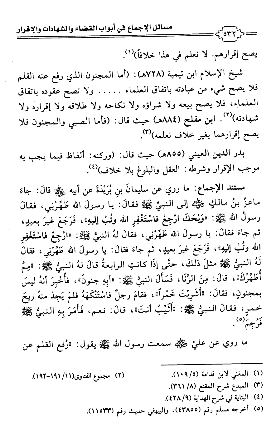 شيخ الإسلام ابن تيمية (728 هـ): (أما المجنون الذي رفع عنه القلم فلا يصح شيء من عبادته باتفاق العلماء. . . . ولا تصح عقوده باتفاق العلماء، فلا يصح بيعه ولا شراؤه ولا نكاحه ولا طلاقه ولا إقراره ولا شهادته) (¬2). ابن مفلح (884 هـ) حيث قال: (فأما الصبي والمجنون فلا يصح إقرارهما بغير خلاف نعلمه) (¬3).