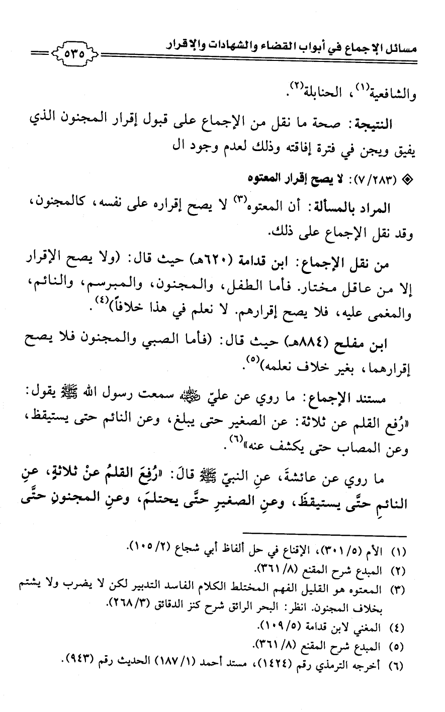 • من نقل الإجماع: ابن قدامة (620 هـ) حيث قال: (ولا يصح الإقرار إلا من عاقل مختار. فأما الطفل، والمجنون، والمبرسم، والنائم، والمغمى عليه، فلا يصح إقرارهم. لا نعلم في هذا خلافًا) (¬4).