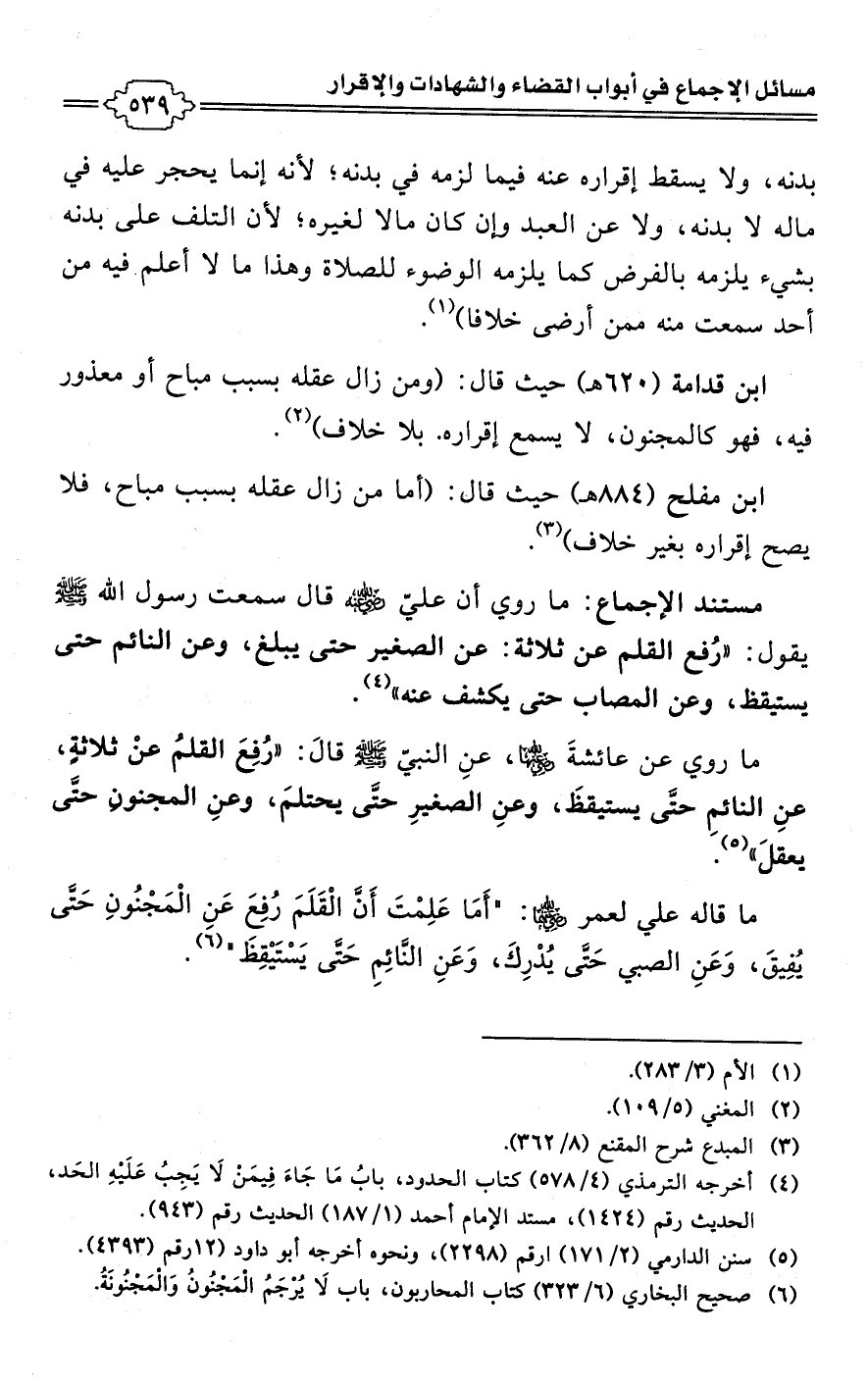 ابن قدامة (620 هـ) حيث قال: (ومن زال عقله بسبب مباح أو معذور فيه، فهو كالمجنون، لا يسمع إقراره. بلا خلاف) (¬2).