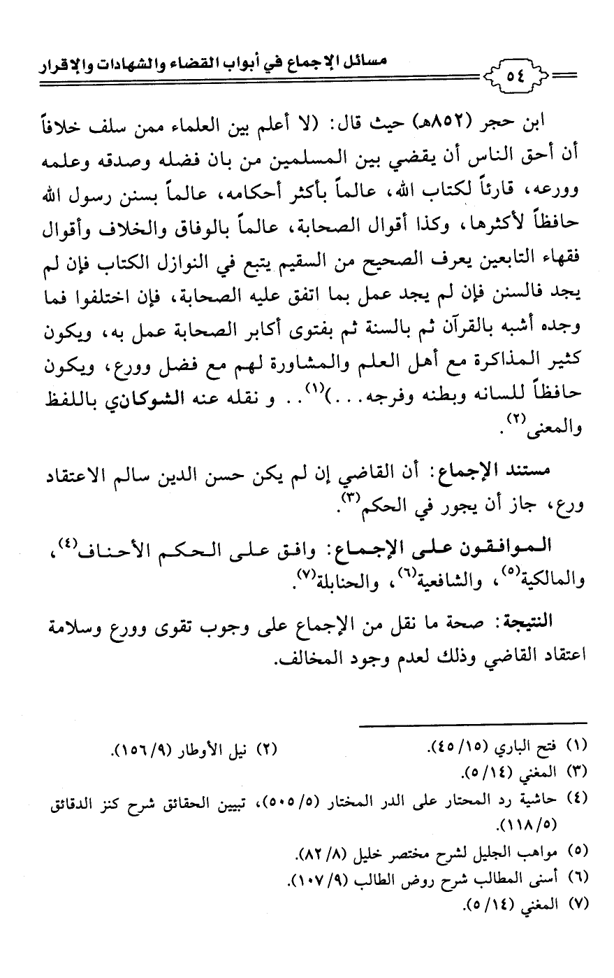 ابن حجر (852 هـ) حيث قال: (لا أعلم بين العلماء ممن سلف خلافًا أن أحق الناس أن يقضي بين المسلمين من بأن فضله وصدقه وعلمه وورعه، قارئًا لكتاب اللَّه، عالمًا بأكثر أحكامه، عالمًا بسنن رسول اللَّه حافظًا لأكثرها، وكذا أقوال الصحابة، عالمًا بالوفاق والخلاف وأقوال فقهاء التابعين يعرف الصحيح من السقيم يتبع في النوازل الكتاب فإن لم يجد فالسنن فإن لم يجد عمل بما اتفق عليه الصحابة، فإن اختلفوا فما وجده أشبه بالقرآن ثم بالسنة ثم بفتوى أكابر الصحابة عمل به، ويكون كثير المذاكرة مع أهل العلم والمشاورة لهم مع فضل وورع، ويكون حافظًا للسانه وبطنه وفرجه. . .) (¬1). . ونقله عنه الشوكاني باللفظ والمعنى (¬2).