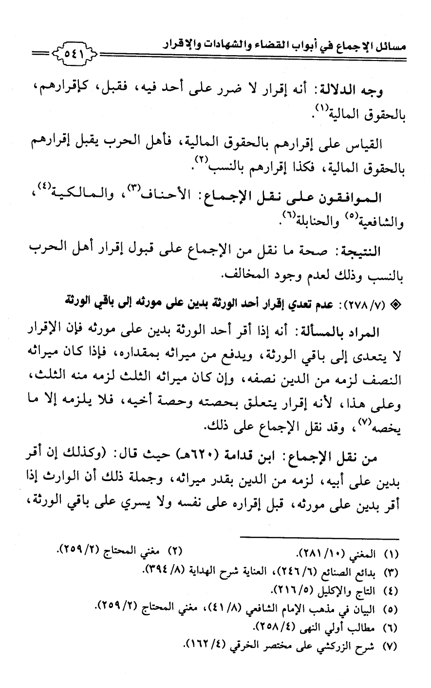 • من نقل الإجماع: ابن قدامة (620 هـ) حيث قال: (وكذلك إن أقر بدين على أبيه، لزمه من الدين بقدر ميراثه، وجملة ذلك أن الوارث إذا أقر بدين على مورثه، قبل إقراره على نفسه ولا يسري على باقي الورثة،