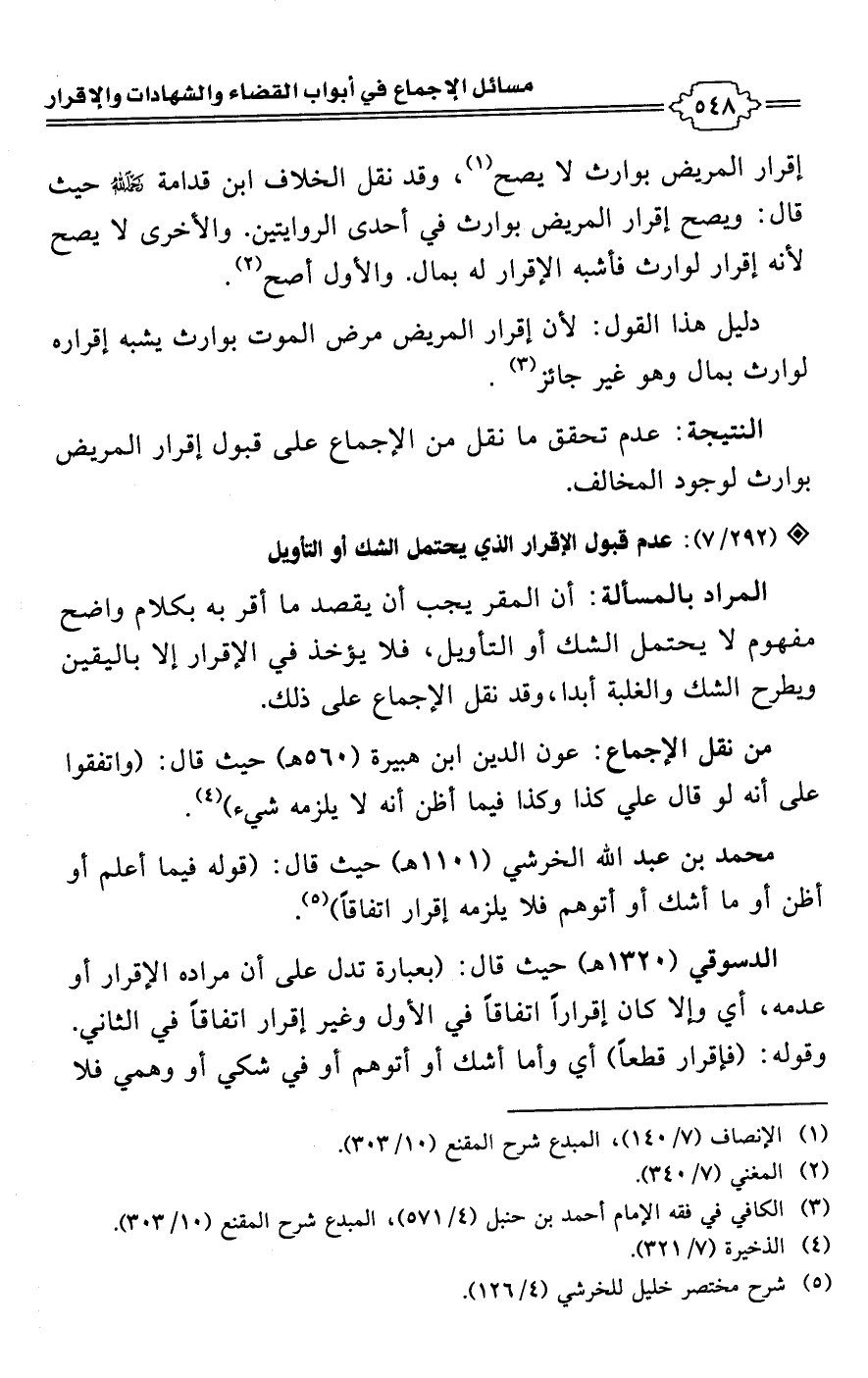 محمد بن عبد اللَّه الخرشي (1101 هـ) حيث قال: (قوله فيما أعلم أو أظن أو ما أشك أو أتوهم فلا يلزمه إقرار اتفاقًا) (¬5).