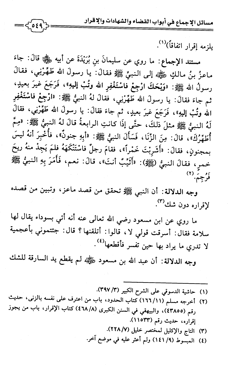 • مستند الإجماع: ما روي عن سليمانَ بنِ بُرَيْدَةَ عن أبيه -رضي اللَّه عنهما- قالَ: جاءَ ماعزُ بنُ مالكٍ -رضي اللَّه عنه- إلى النبيِّ -صلى اللَّه عليه وسلم- فقالَ: يا رسولَ اللَّه طَهِّرْنِي، فقالَ رسولُ اللَّه -صلى اللَّه عليه وسلم-: "وَيْحَكَ ارْجِعْ فاسْتَغْفِرِ اللَّه وتُبْ إليهِ"، فَرَجَعَ غيرَ بعيدٍ، ثم جاءَ فقالَ: يا رسولَ اللَّه طَهِّرْنِي، فقالَ لهُ النبيُّ -صلى اللَّه عليه وسلم-: "ارْجِعْ فاسْتَغْفِرِ اللَّه وتُبْ إليهِ"، فَرَجَعَ غيرَ بعيدٍ، ثم جاءَ فقالَ: يا رسولَ اللَّه طَهِّرْني، فقالَ لَهُ النبيُّ -صلى اللَّه عليه وسلم- مثلَ ذلكَ، حتى إذَا كانتِ الرابعةُ قالَ لهُ النبيُّ -صلى اللَّه عليه وسلم-: "مِمّ أُطَهِّرُكَ"، قالَ: مِنَ الزِّنَا، فَسَأَلَ النبيُّ -صلى اللَّه عليه وسلم-: "أبِهِ جنونٌ"، فأُخْبِرَ أنهُ ليسَ بمجنونٍ، فقالَ: "أَشَرِبْتَ خَمْرًا"، فقامَ رجلٌ فاسْتَنْكَهَهُ فلمَ يَجِدْ منهُ ريحَ خمرٍ، فقالَ النبيُّ (-صلى اللَّه عليه وسلم-): "أَثَيِّبٌ أنتَ"، قالَ: نعم، فَأَمَرَ بِهِ النبيُّ -صلى اللَّه عليه وسلم- فَرُجِمَ. (¬2)