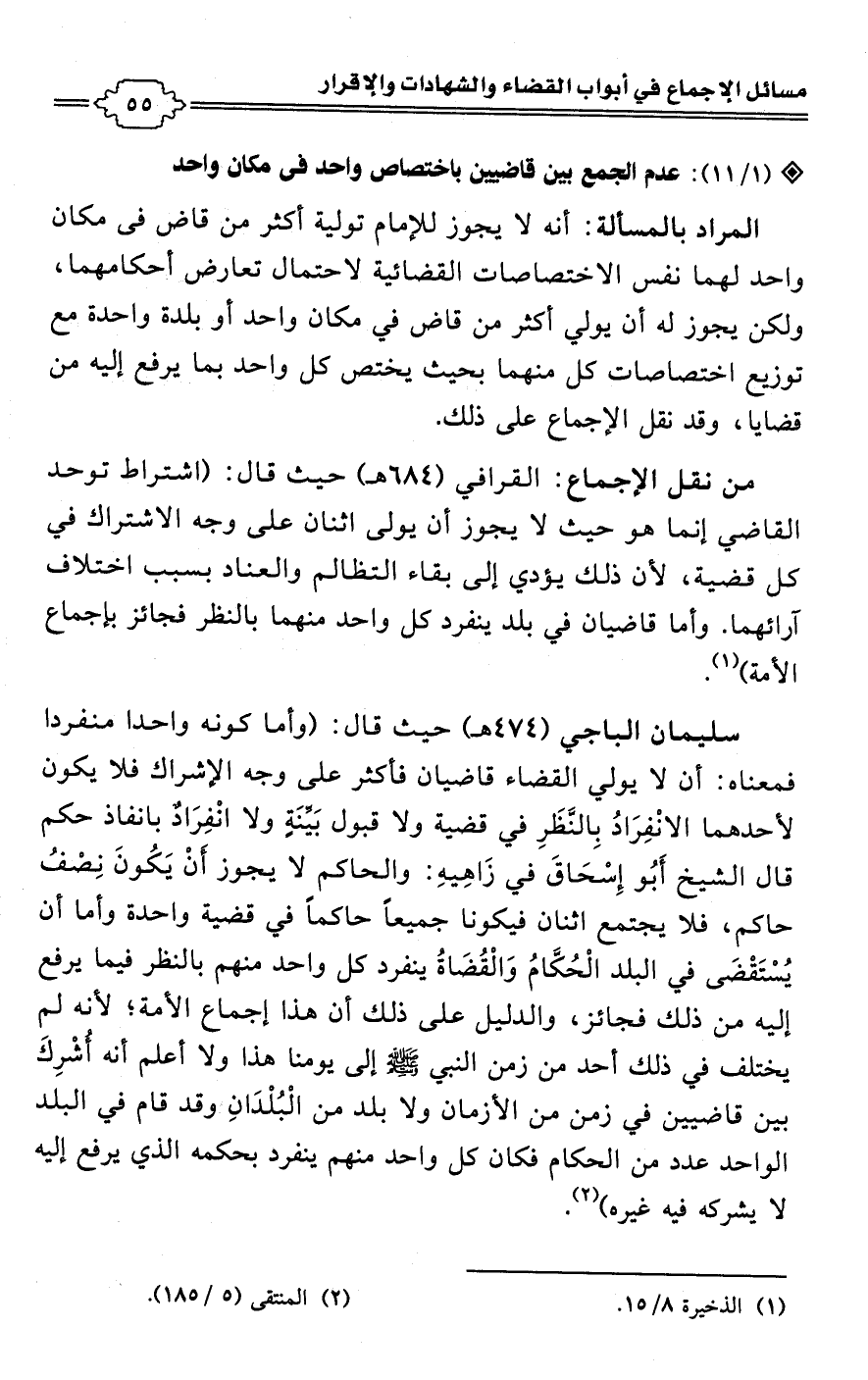 • من نقل الإجماع: القرافي (684 هـ) حيث قال: (اشتراط توحد القاضي إنما هو حيث لا يجوز أن يولى اثنان على وجه الاشتراك في كل قضية، لأن ذلك يؤدي إلى بقاء التظالم والعناد بسبب اختلاف آرائهما. وأما قاضيان في بلد ينفرد كل واحد منهما بالنظر فجائز بإجماع الأمة) (¬1).