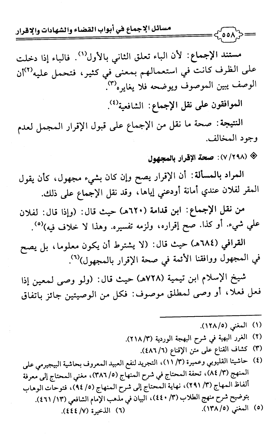 القرافي (684 هـ) حيث قال: (لا يشترط أن يكون معلوما، بل يصح في المجهول ووافقنا الأئمة في صحة الإقرار بالمجهول) (¬6).
