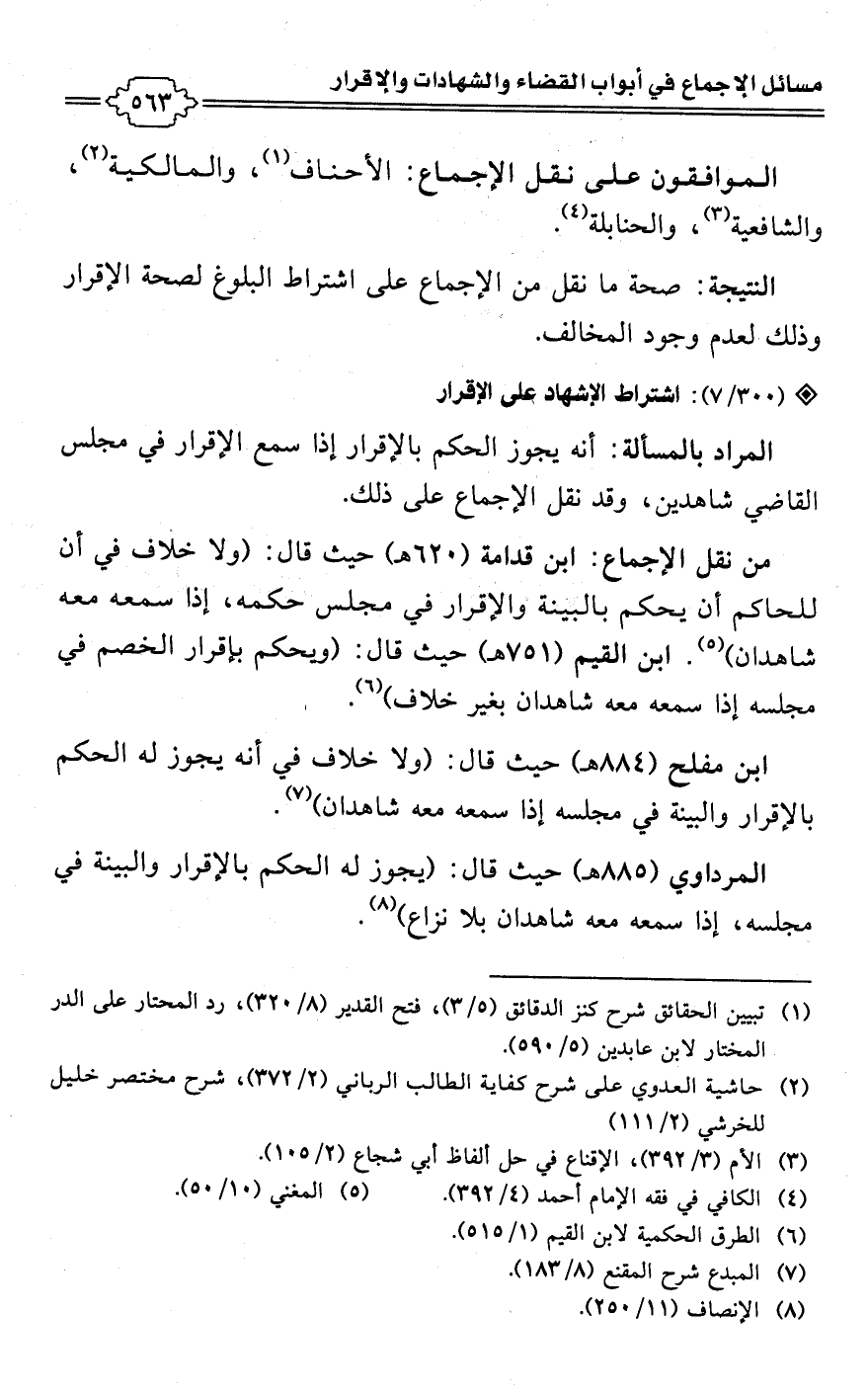 • من نقل الإجماع: ابن قدامة (620 هـ) حيث قال: (ولا خلاف في أن للحاكم أن يحكم بالبينة والإقرار في مجلس حكمه، إذا سمعه معه شاهدان) (¬5). ابن القيم (751 هـ) حيث قال: (ويحكم بإقرار الخصم في مجلسه إذا سمعه معه شاهدان بغير خلاف) (¬6).