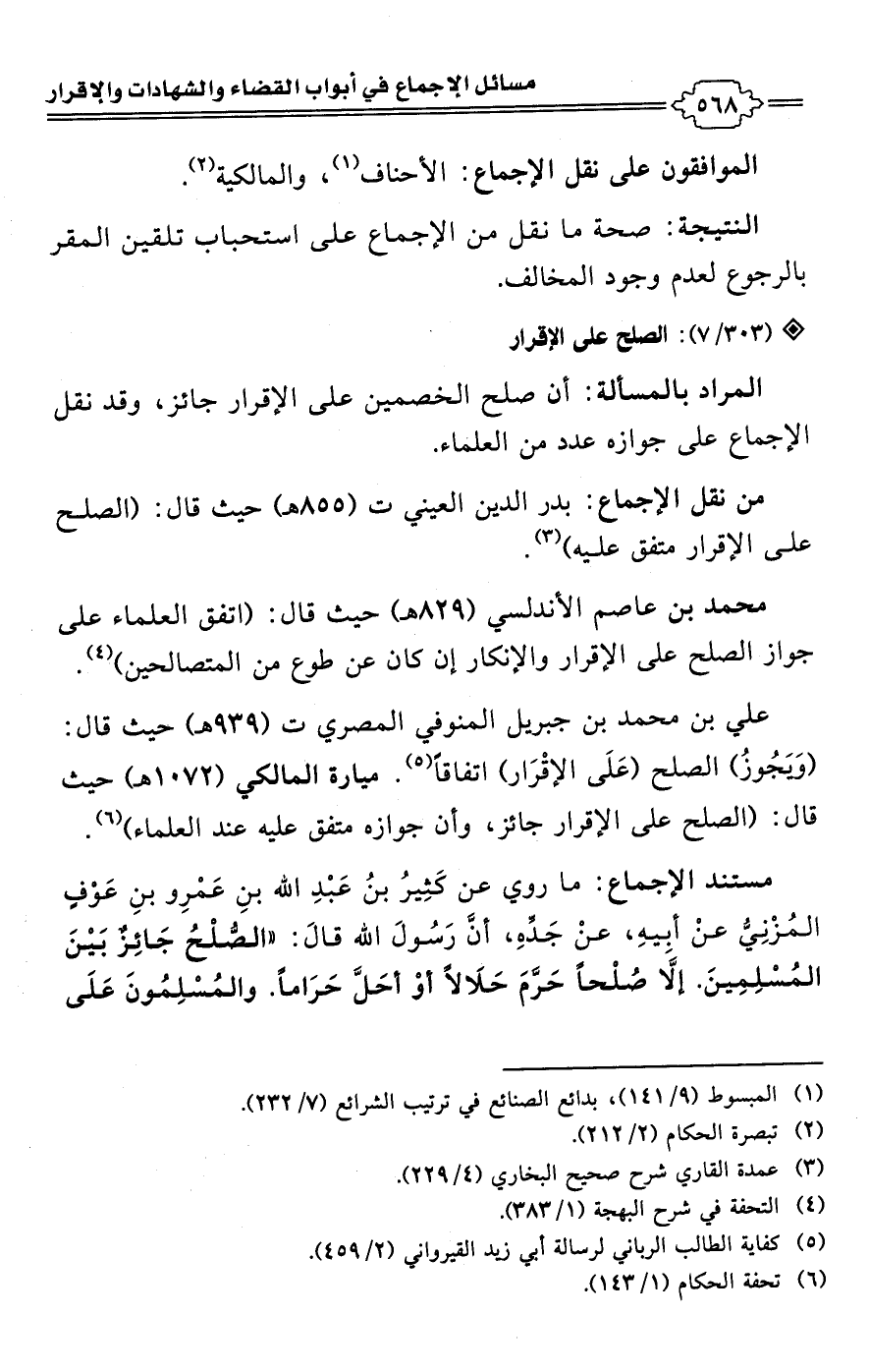 • مستند الإجماع: ما روي عن كثِيرُ بنُ عَبْدِ اللَّه بنِ عَمْرِو بنِ عَوْفٍ المُزْنِيُّ عنْ أبِيهِ، عنْ جَدِّهِ، أن رَسُولَ اللَّه قالَ: "الصُّلْحُ جَائِزٌ بَيْنَ المُسْلِمِينَ. إلا صُلْحًا حَرَّمَ حَلَالًا أوْ أحَلَّ حَرَامًا. والمُسْلِمُونَ عَلَى