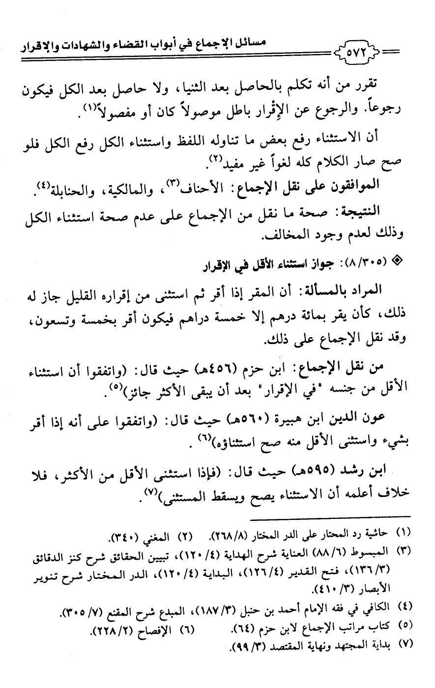 • من نقل الإجماع: ابن حزم (456 هـ) حيث قال: (واتفقوا أن استثناء الأقل من جنسه "في الإقرار" بعد أن يبقى الأكثر جائز) (¬5).