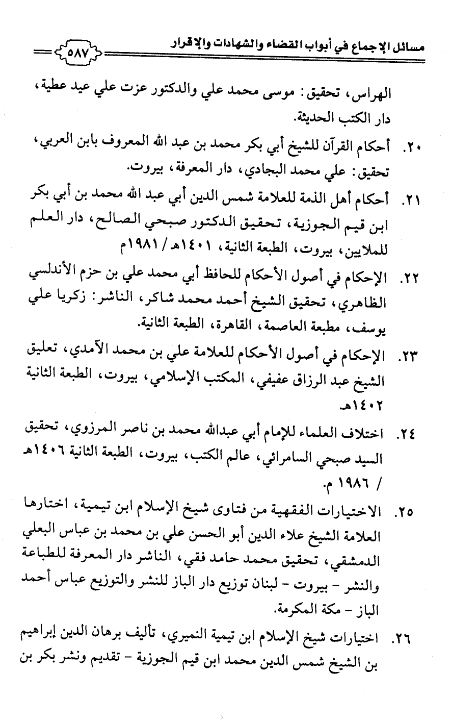 22 - الإحكام في أصول الأحكام للحافظ أبي محمد علي بن حزم الأندلسي الظاهري، تحقيق الشيخ أحمد محمد شاكر، الناشر: زكريا علي يوسف، مطبعة العاصمة، القاهرة، الطبعة الثانية.