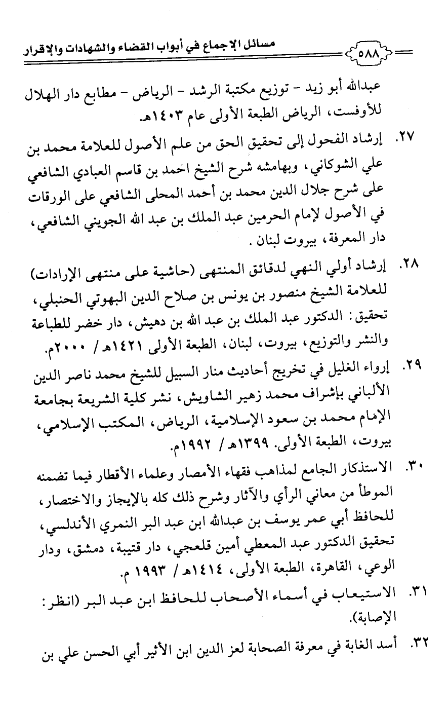 28 - إرشاد أولي النهى لدقائق المنتهى (حاشية على منتهى الإرادات) للعلامة الشيخ منصور بن يونس بن صلاح الدين البهوتي الحنبلي، تحقيق: الدكتور عبد الملك بن عبد اللَّه بن دهيش، دار خضر للطباعة والنشر والتوزيع، بيروت، لبنان، الطبعة الأولى 1421 هـ/ 2000 م.