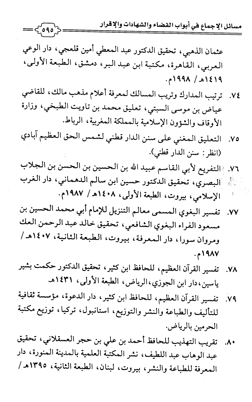 76 - التفريع لأبي القاسم عبيد اللَّه بن الحسين بن الحسن بن الجلاب البصري، تحقيق الدكتور حسين ابن سالم الدهماني، دار الغرب الإسلامي، بيروت، الطبعة الأولى، 1408 هـ/ 1987 م.