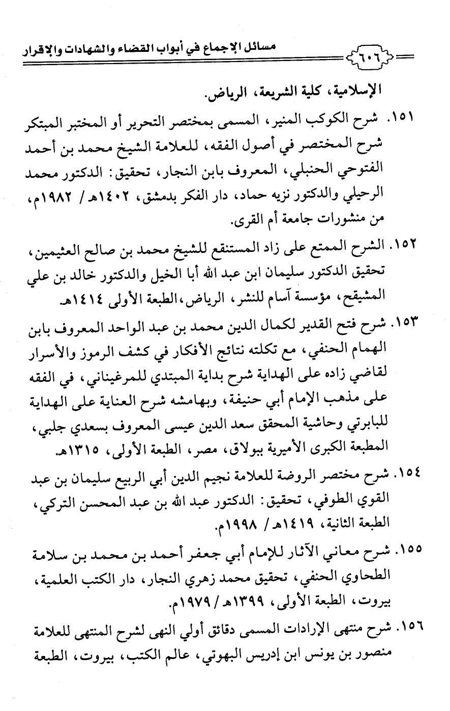 151 - شرح الكوكب المنير، المسمى بمختصر التحرير أو المختبر المبتكر شرح المختصر في أصول الفقه، للعلامة الشيخ محمد بن أحمد الفتوحي الحنبلي، المعروف بابن النجار، تحقيق: الدكتور محمد الرحيلي والدكتور نزيه حماد، دار الفكر بدمشق، 1402 هـ/ 1982 م، من منشورات جامعة أم القرى.