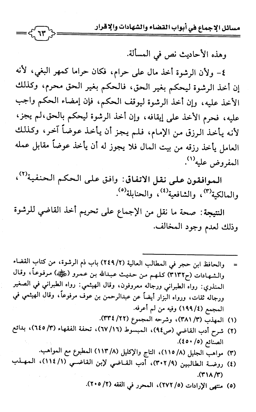 • الموافقون على نقل الاتفاق: وافق على الحكم الحنفية (¬2)، والمالكية (¬3)، والشافعية (¬4)، والحنابلة (¬5).Rصحة ما نقل من الإجماع على تحريم أخذ القاضي للرشوة وذلك لعدم وجود المخالف.