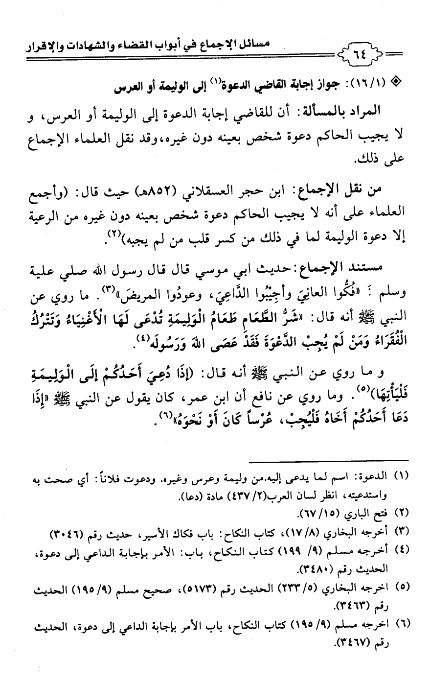 • من نقل الإجماع: ابن حجر العسقلاني (852 هـ) حيث قال: (وأجمع العلماء على أنه لا يجيب الحاكم دعوة شخص بعينه دون غيره من الرعية إلا دعوة الوليمة لما في ذلك من كسر قلب من لم يجبه) (¬2).