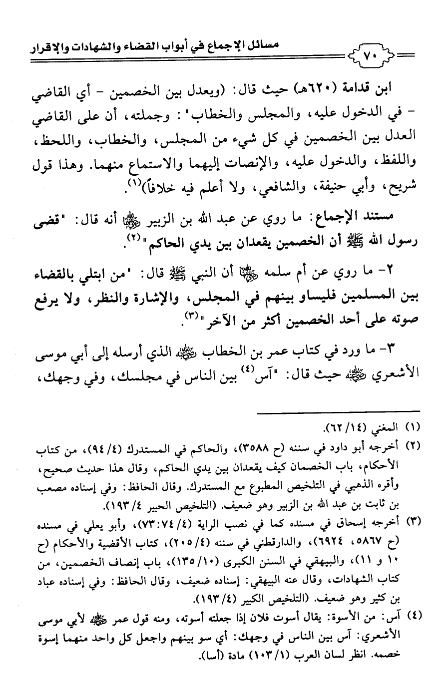 ابن قدامة (620 هـ) حيث قال: (ويعدل بين الخصمين -أي القاضي- في الدخول عليه، والمجلس والخطاب": وجملته، أن على القاضي العدل بين الخصمين في كل شيء من المجلس، والخطاب، واللحظ، واللفظ، والدخول عليه، والإنصات إليهما والاستماع منهما. وهذا قول شريح، وأبي حنيفة، والشافعي، ولا أعلم فيه خلافًا) (¬1).