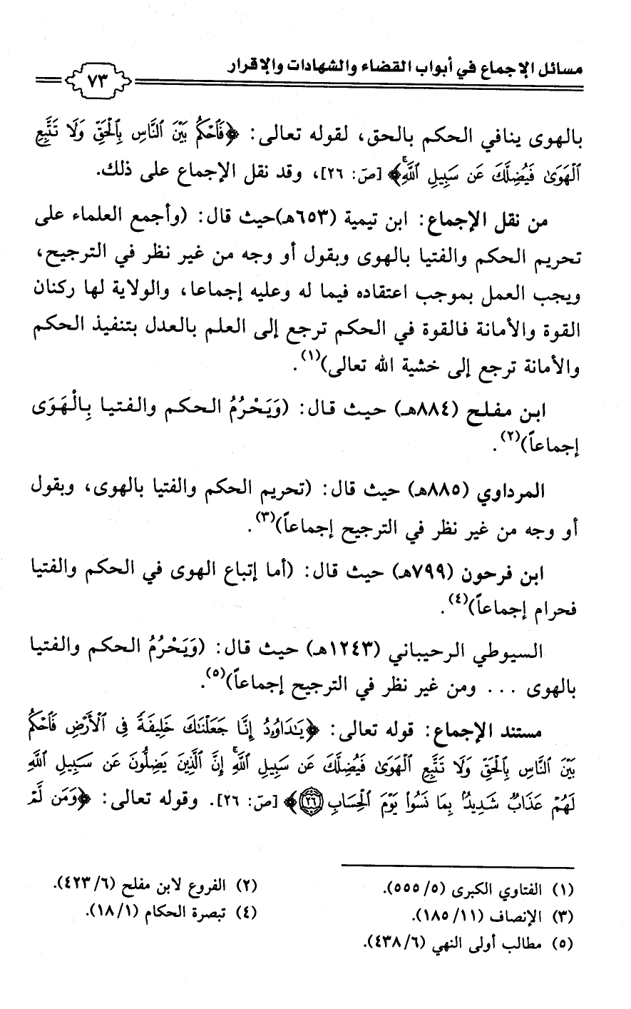 ابن مفلح (884 هـ) حيث قال: (وَيَحْرُمُ الحكم والفتيا بِالْهَوَى إجماعًا) (¬2).