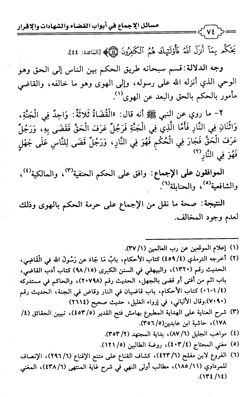 • الموافقون على الإجماع: وافق على الحكم الحنفية (¬3)، والمالكية (¬4)، والشافعية (¬5)، والحنابلة (¬6).Rصحة ما نقل من الإجماع على حرمة الحكم بالهوى وذلك لعدم وجود المخالف.