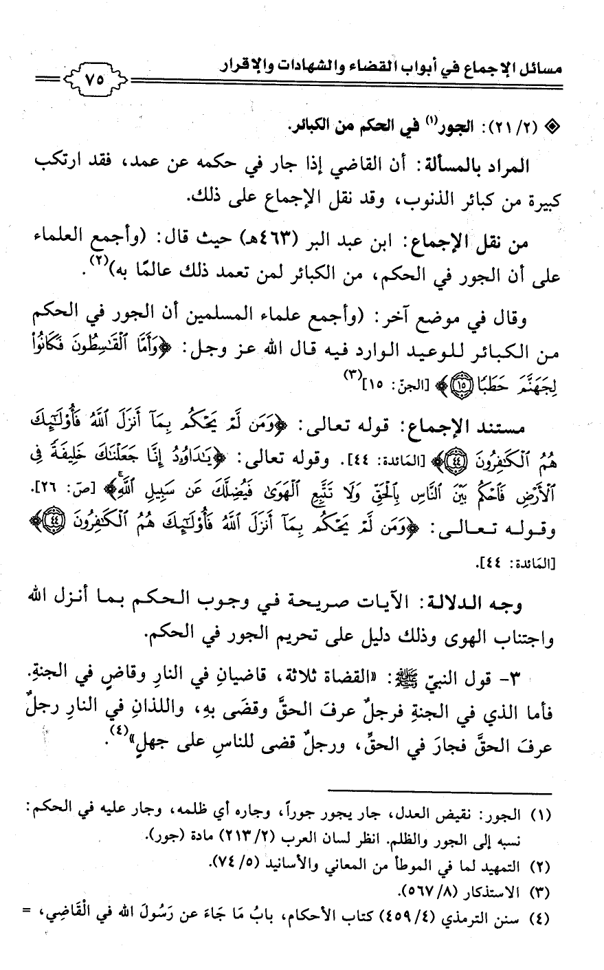 • من نقل الإجماع: ابن عبد البر (463 هـ) حيث قال: (وأجمع العلماء على أن الجور في الحكم، من الكبائر لمن تعمد ذلك عالمًا به) (¬2).