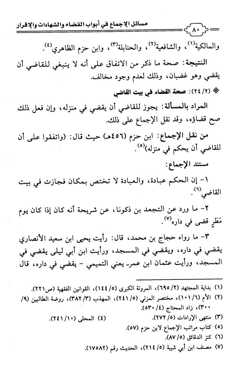 • من نقل الإجماع: ابن حزم (456 هـ) حيث قال: (واتفقوا على أن للقاضي أن يحكم في منزله) (¬5).