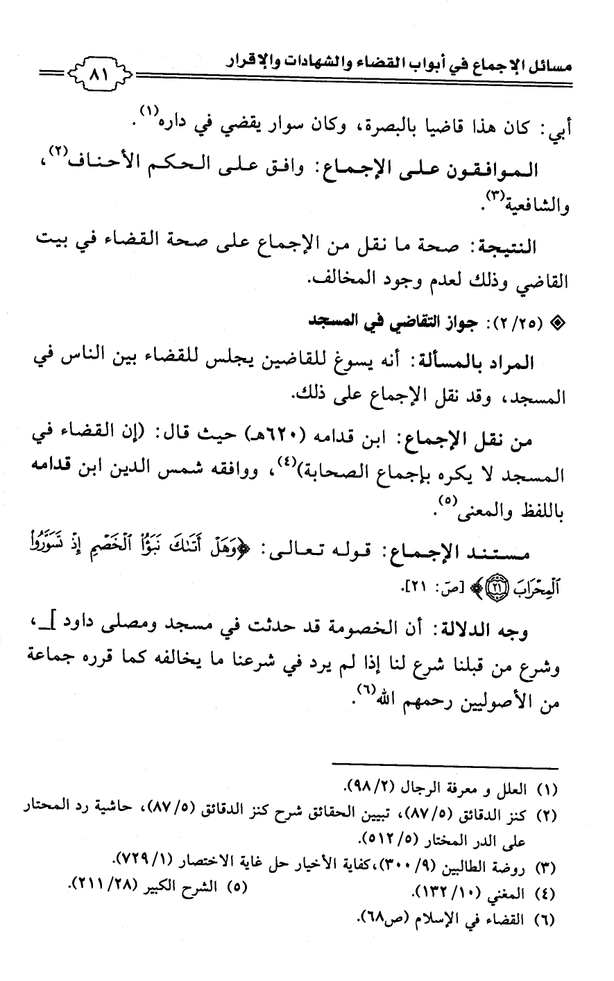 • من نقل الاجماع: ابن قدامه (620 هـ) حيث قال: (إن القضاء في المسجد لا يكره بإجماع الصحابة) (¬4)، ووافقه شمس الدين ابن قدامه باللفظ والمعنى (¬5).