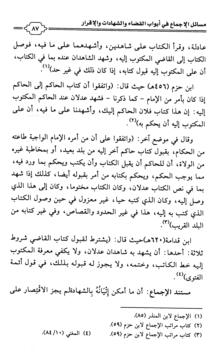 وقال في موضع آخر: (واتفقوا على أن من أمره الإمام الواجبة طاعته من الحكام، بقبول كتاب حاكم آخر إليه من بلد بعيد، أو بمخاطبة غيره من الولاة، أن للحاكم أن يقبل الكتاب وأن يكتب ويحكم بما ورد فيه، مما يوجب الحكم، ويحكم بكتابه من أمر بقبوله أيضًا، كذلك إذا شهد بما في نص الكتاب عدلان، وكان الكتاب مختوما، وكان إلى هذا الذي وصل إليه، وكان الذي كتبه حيا، غير معزول في حين وصول الكتاب الذي كتب به إليه، هذا في غير الحدود والقصاص، وفي غير كتابه من البلد القريب) (¬3).