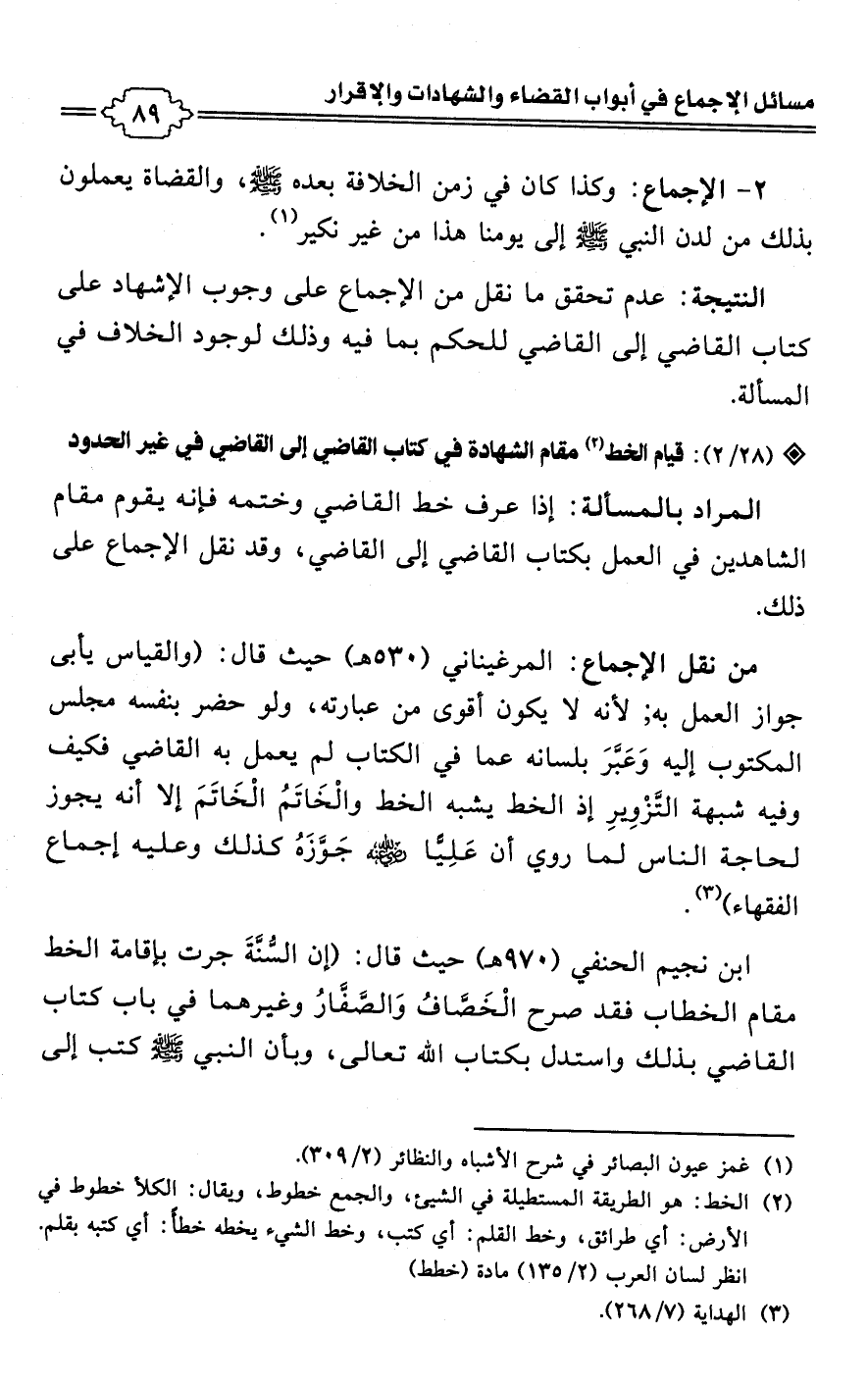 2 - الإجماع: وكذا كان في زمن الخلافة بعده -صلى اللَّه عليه وسلم-، والقضاة يعملون بذلك من لدن النبي -صلى اللَّه عليه وسلم- إلى يومنا هذا من غير نكير (¬1).Rعدم تحقق ما نقل من الإجماع على وجوب الإشهاد على كتاب القاضي إلى القاضي للحكم بما فيه وذلك لوجود الخلاف في المسألة.