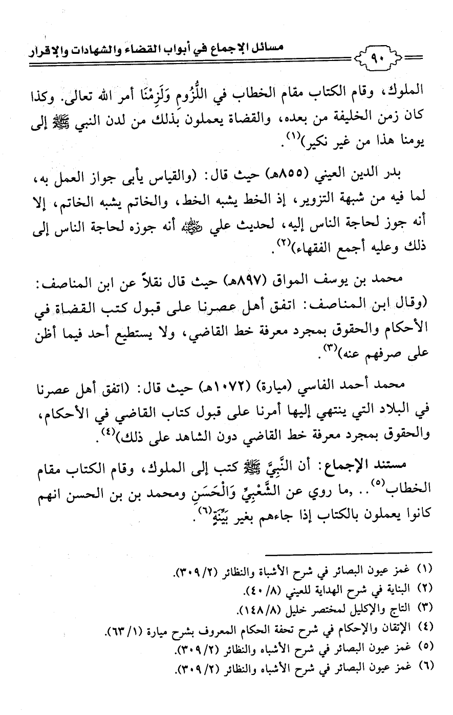 بدر الدين العيني (855 هـ) حيث قال: (والقياس يأبى جواز العمل به، لما فيه من شبهة التزوير، إذ الخط يشبه الخط، والخاتم يشبه الخاتم، إلا أنه جوز لحاجة الناس إليه، لحديث علي -رضي اللَّه عنه- أنه جوزه لحاجة الناس إلى ذلك وعليه أجمع الفقهاء) (¬2).